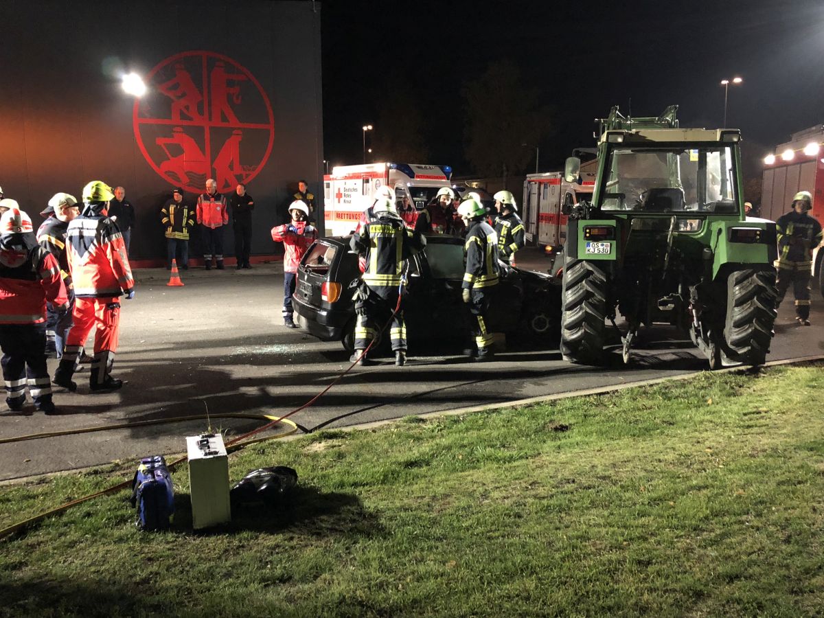 Im praktischen Teil wurde ein Frontalcrash zwischen PKW und Traktor simuliert. Im PKW fanden die Retter zwei eingeklemmte Personen vor. Einer davon leicht, der andere schwer verletzt. In enger Absprache zwischen Feuerwehr und Rettungsdienst wurden jetzt die Versorgung und Bergung der Patienten geübt, sowie die Kommunikation zwischen den beiden leitenden Funktionären an der Einsatzstelle.